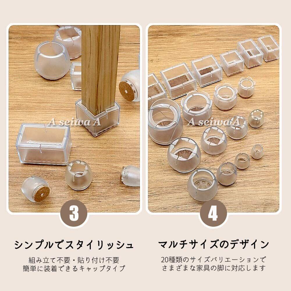 丸形タイプ、丸/四角共用タイプ、正方形タイプ、長方形タイプの全20種類のサイズバリエーションで、さまざまな家具の脚に対応します。